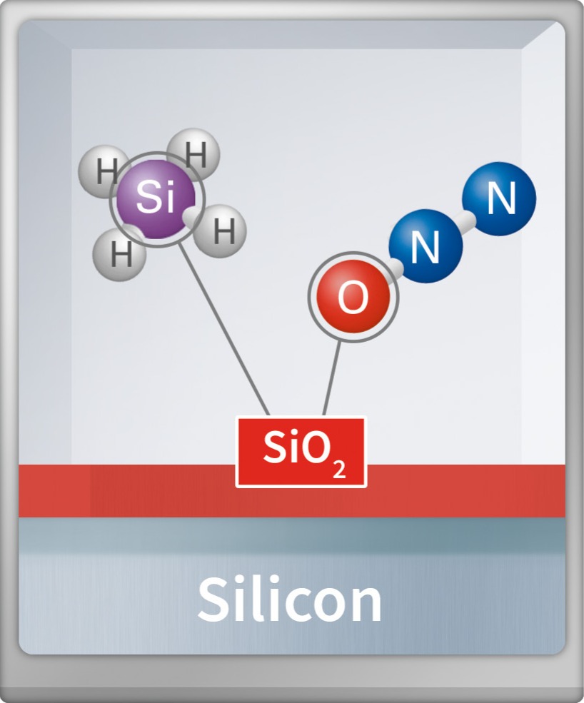 Although its medical application is the best-known usage for N2O by far, there are manifold applications existent for Nitrous Oxide, e.g. for a power enhancement of a combustion engine, as an oxidizer in rocket motors or as an aerosol spray propellant. However, high-purity Nitrous Oxide is increasingly used in the semiconductor industry, predominantly as a precursor for the controlled deposition of thin films onto a wafer. In particular, N2O UHP is – in combination with Silicon precursors such as Silane – crucial for the production of high-quality insulating Silicon Oxide layers, as depicted in the icon below: