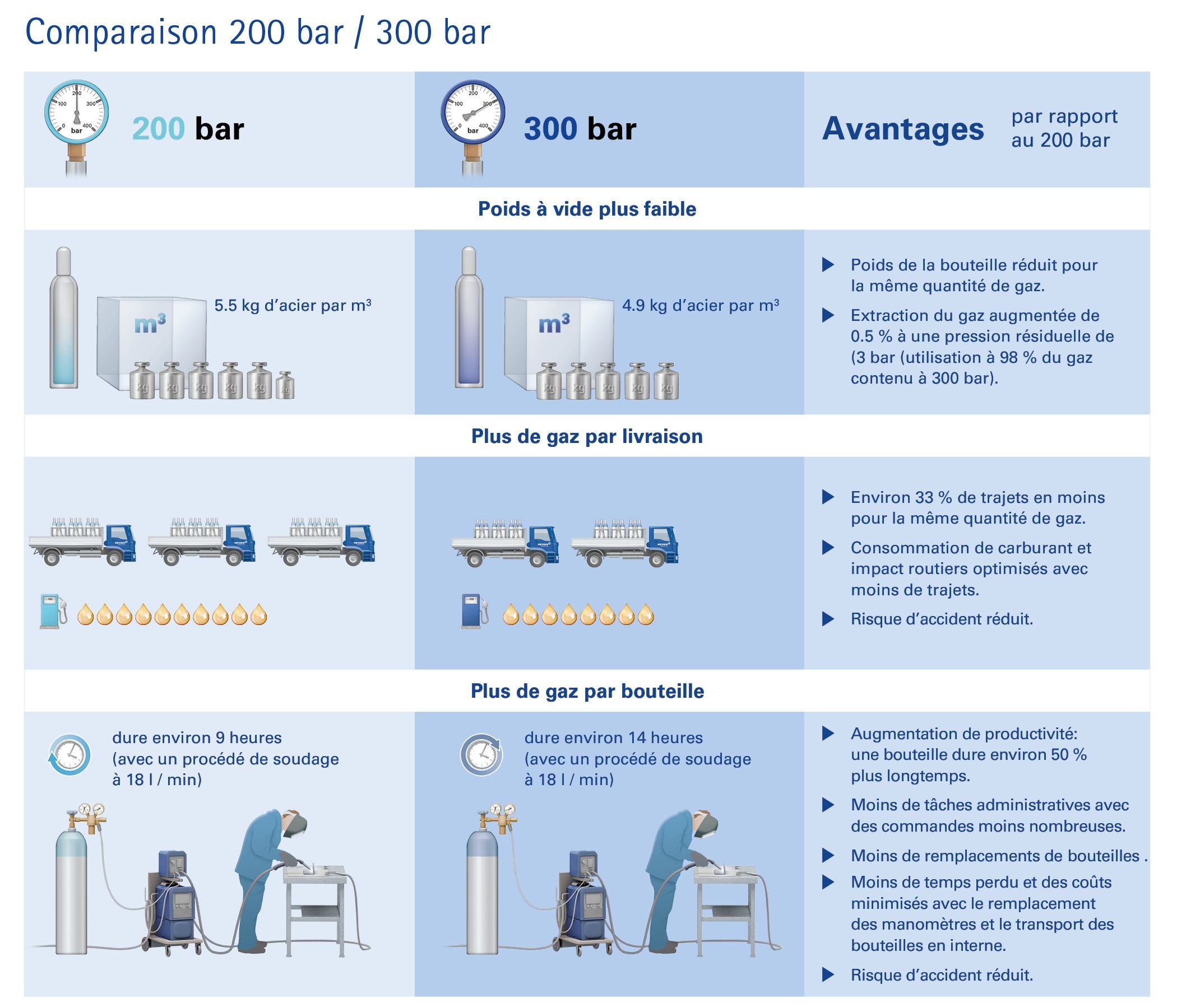 La technologie 300 bar permet de réduire le nombre de bouteilles louées, et donc de réduire les coûts de location par rapport à la technologie 200 bar.
