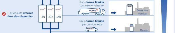 La possibilité la plus économique de livrer des quantités moyennes à grandes est l'approvisionnement par camion-citerne. Messer exploite une flotte de semi-remorques ou de conteneurs spéciaux pour les gaz cryogéniques comme l'azote, l'oxygène, l'argon, le dioxyde de carbone ou l'hélium. Ces gaz sont livrés sous forme liquide, car le volume de stockage nécessaire est nettement moins important qu'à l'état gazeux.